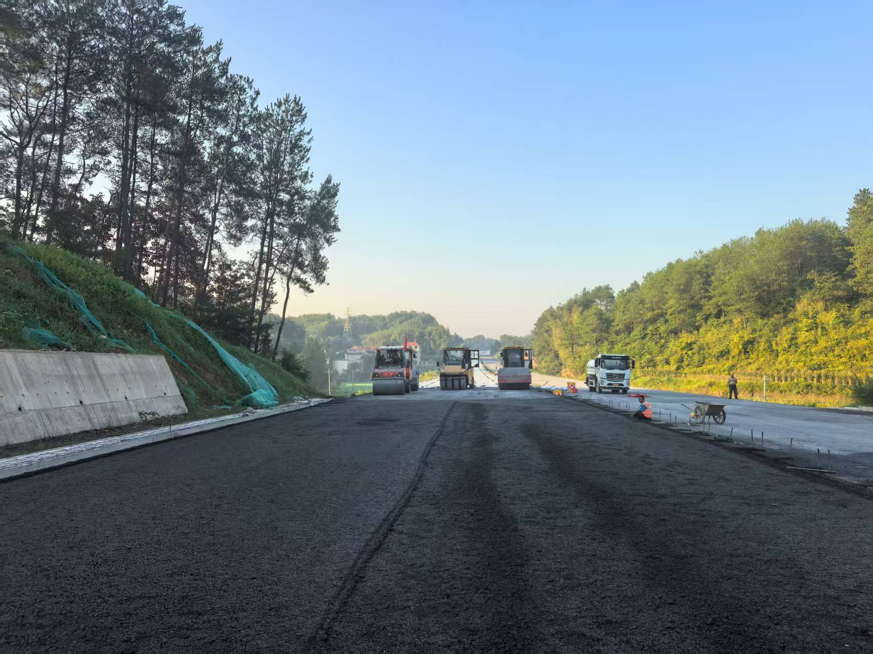 G59新新高速項(xiàng)目主線路面(不含橋梁)共16.7公里,水穩(wěn)層施工包含底基層、下基層、上基層三層結(jié)構(gòu)。自2024年9月6日啟動(dòng)攤鋪?zhàn)鳂I(yè),至2025年8月28日圓滿完工,施工期間,項(xiàng)目部共投入2臺攤鋪機(jī)、2臺單鋼輪壓路機(jī)、1臺膠輪壓路機(jī)、1臺雙鋼輪壓路機(jī)及18輛自卸車,30名施工人員協(xié)同作業(yè),保障施工高效推進(jìn)。