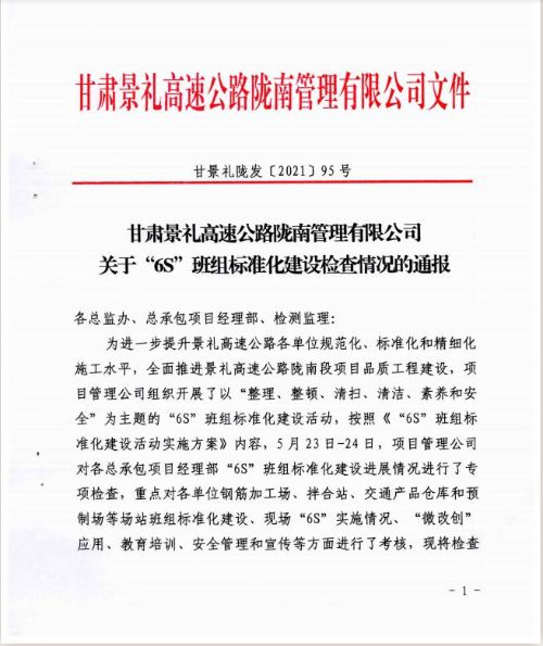 景禮項目部精心組織,合理安排,認真組織實施。5月23日-24日,項目管理公司對各總承包項目經理部“6S” 班組標準化建設進展情況進行了專項檢查,重點檢查了鋼筋加工場、拌合站、交通產品倉庫和預制場等場站班組標準化建設、現場“6S” 實施情況、“微 改創”應用、教育培訓、安全管理和宣傳等方面。依據《S35 景泰至禮縣高速公路隴南段工程(隴南境內)項目考核及獎懲管理辦法(試行)》第二部分第三章工程質量獎懲管理制度第二、三條和第七章監理單位獎懲的規定,經項目管理公司研究,決定對中國二冶集團景禮高速隴南段6標項目經理部通報表揚,并獎勵人民幣貳拾萬元。