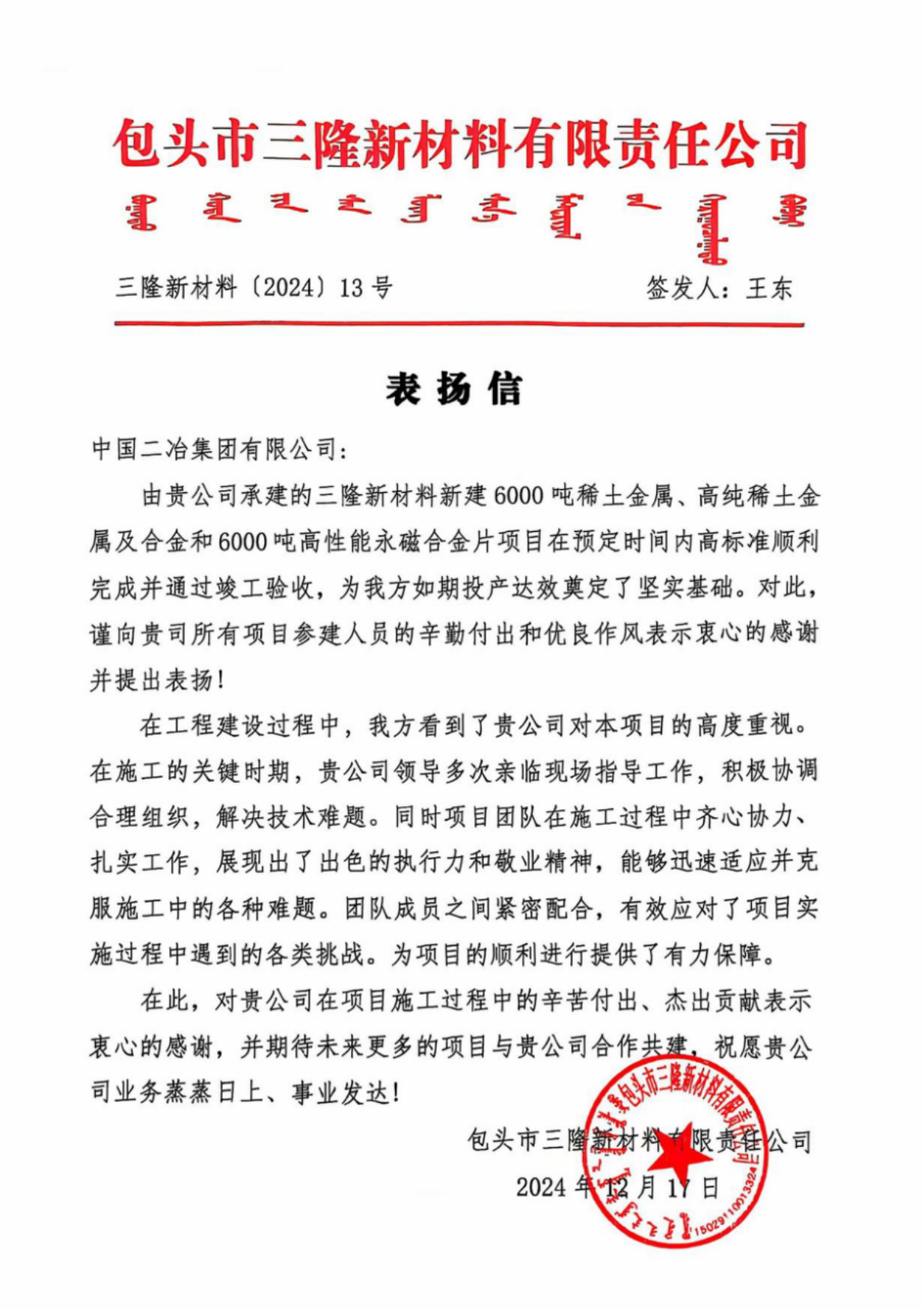 12月25日,中國二冶接連收到包頭金穗實業有限責任公司、包頭市三隆新材料有限責任公司兩封表揚信,對中儲糧項目、三隆項目管理團隊高質量完成既定目標工期的杰出表現提出表揚。