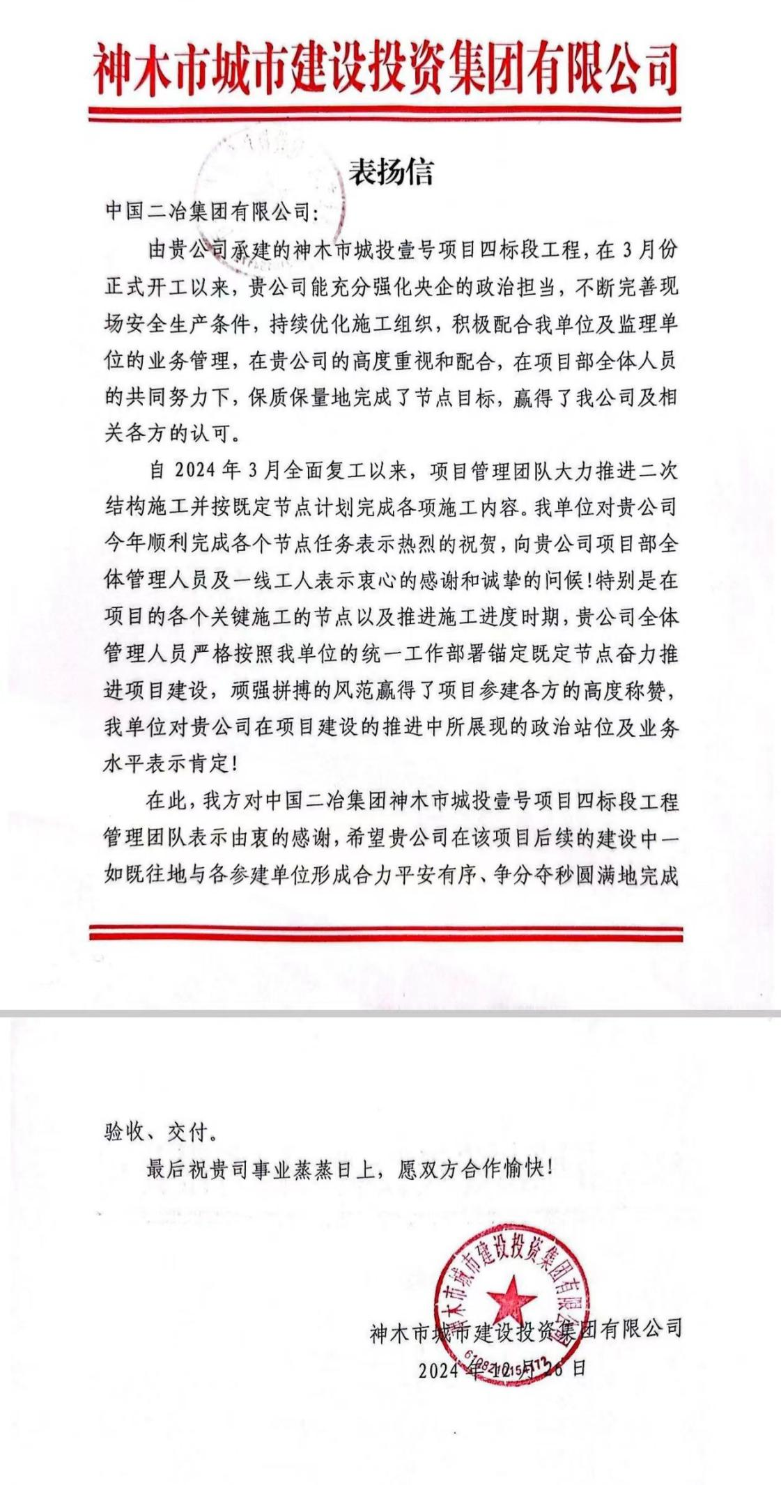 12月26日,中國二冶連續收到神木市城市建設投資集團有限公司和寶雞市陳倉區天王中心衛生院發來的表揚信。表揚信對中國二冶在項目建設過程中展現出的綜合實力表示肯定,對項目按計劃實現工期節點提出表揚。