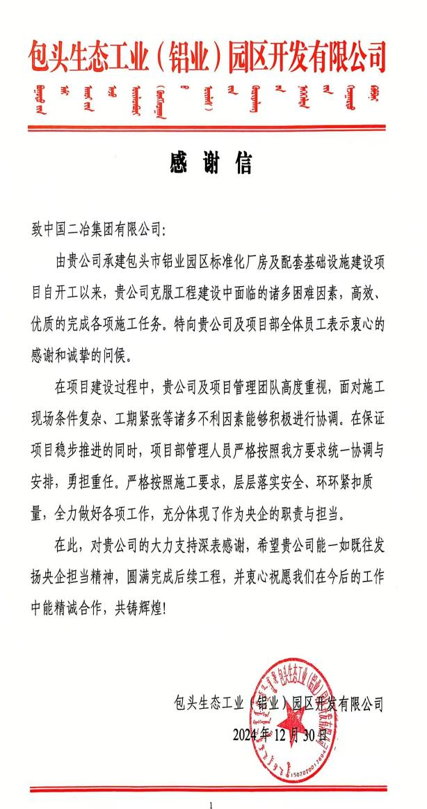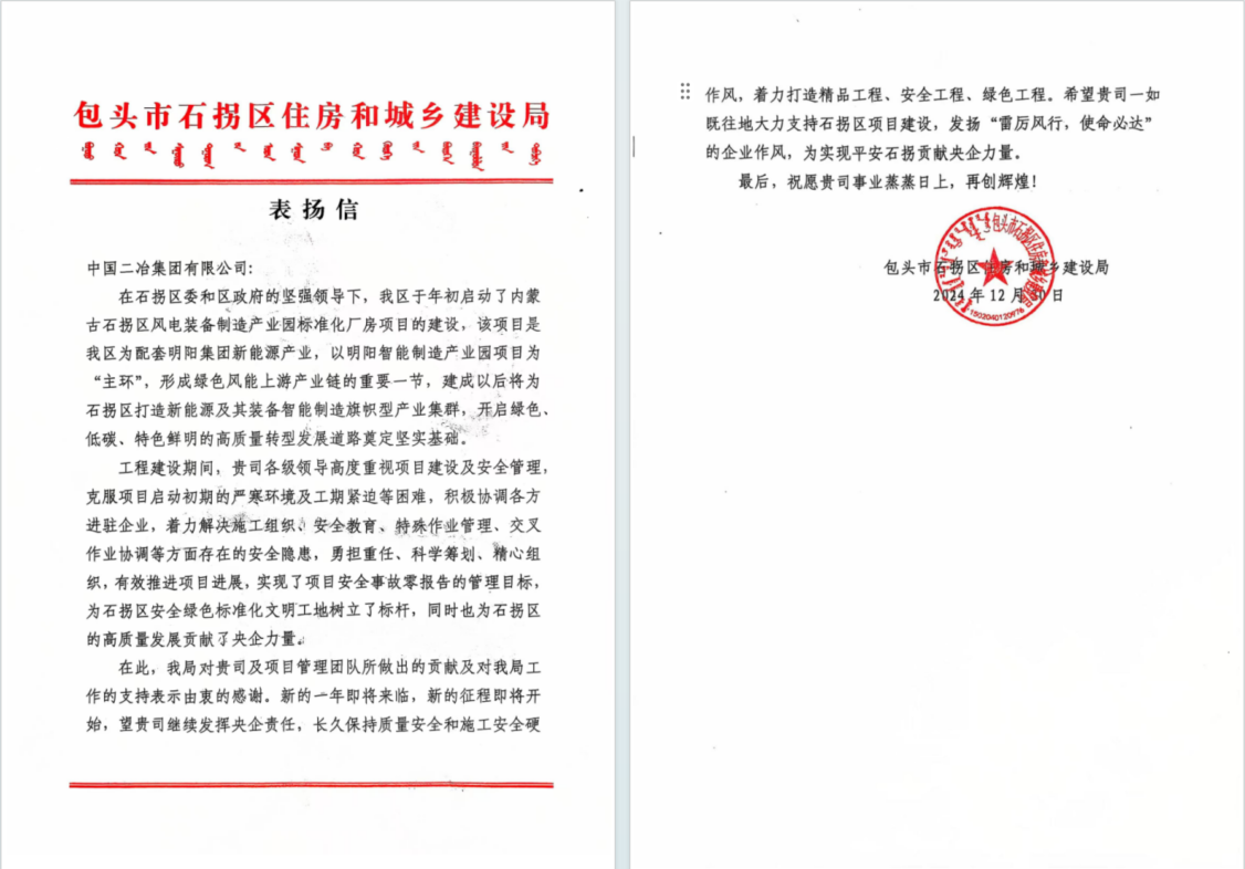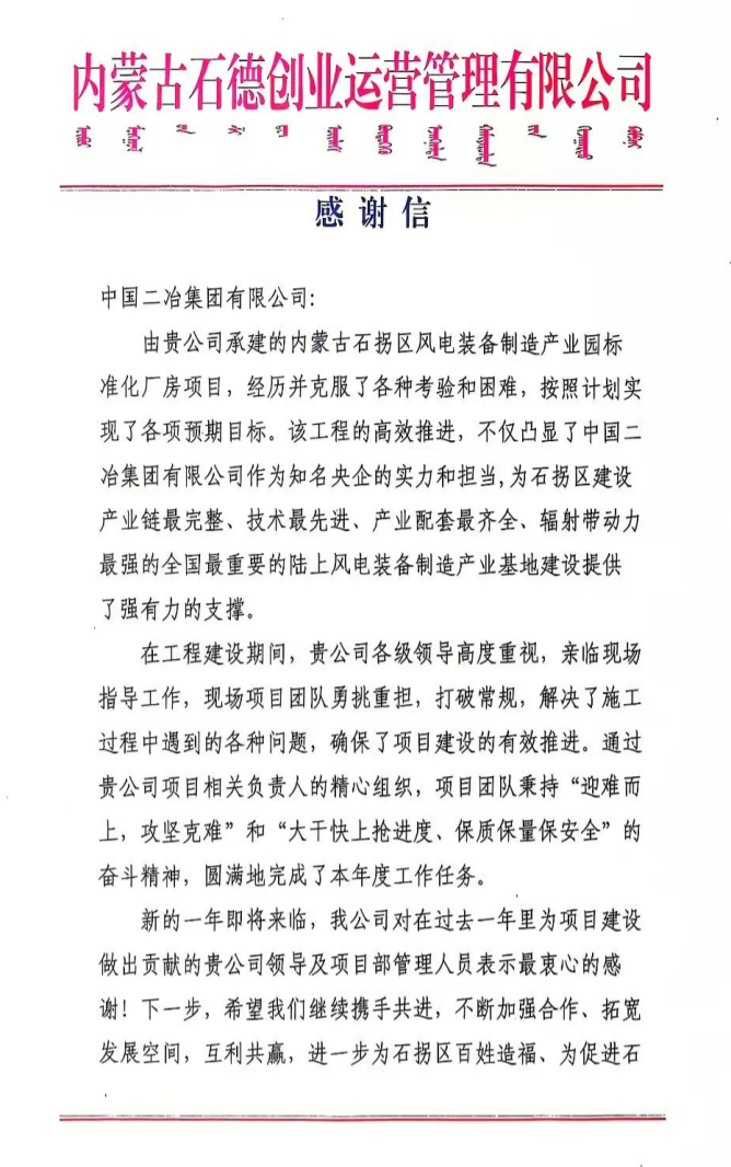 石拐區(qū)住建局在信中指出,內(nèi)蒙古石拐區(qū)風電裝備制造產(chǎn)業(yè)園標準化廠房項目是石拐區(qū)為配套明陽集團新能源產(chǎn)業(yè)形成綠色風能上游產(chǎn)業(yè)鏈的重要項目,在工程建設(shè)期間,中國二冶各級領(lǐng)導(dǎo)高度重視項目建設(shè),項目管理克服項目啟動初期的嚴寒環(huán)境及工期緊迫等困難,勇?lián)厝巍⒖茖W籌劃、精心組織,有效推進項目進展,為石拐區(qū)的高質(zhì)量發(fā)展貢獻了央企力量。