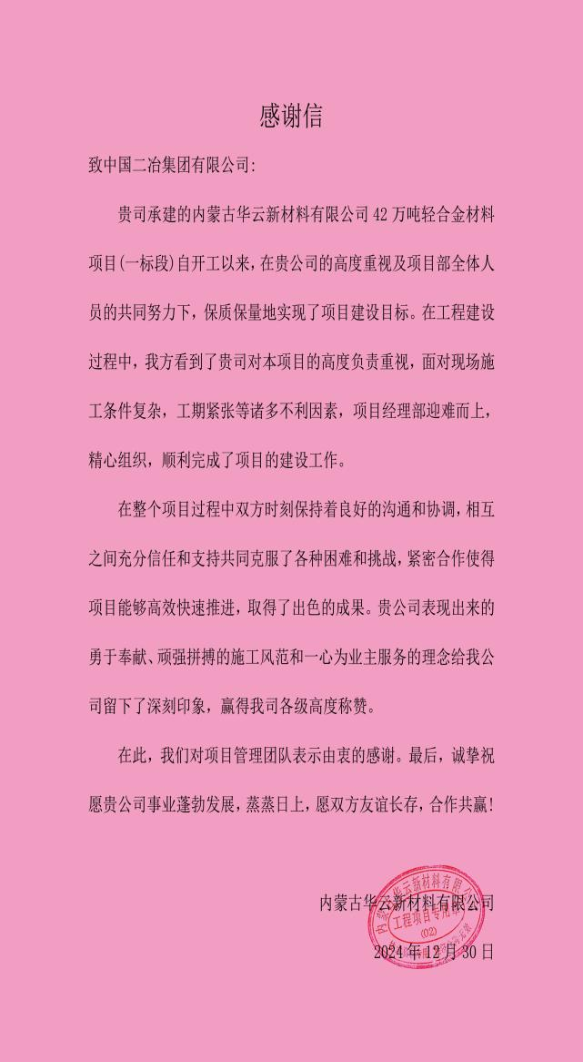 內(nèi)蒙古華云新材料有限公司在表揚信中指出,由中國二冶承建的內(nèi)蒙古華云三期42萬噸輕合金材料項目,在貴公司的高度重視及項目部全體人員的共同努力下,保質(zhì)保量地實現(xiàn)了項目建設(shè)目標,贏得相關(guān)方的高度稱贊。