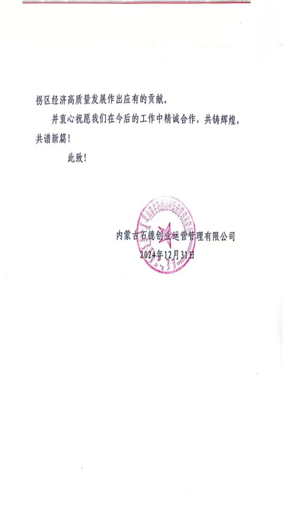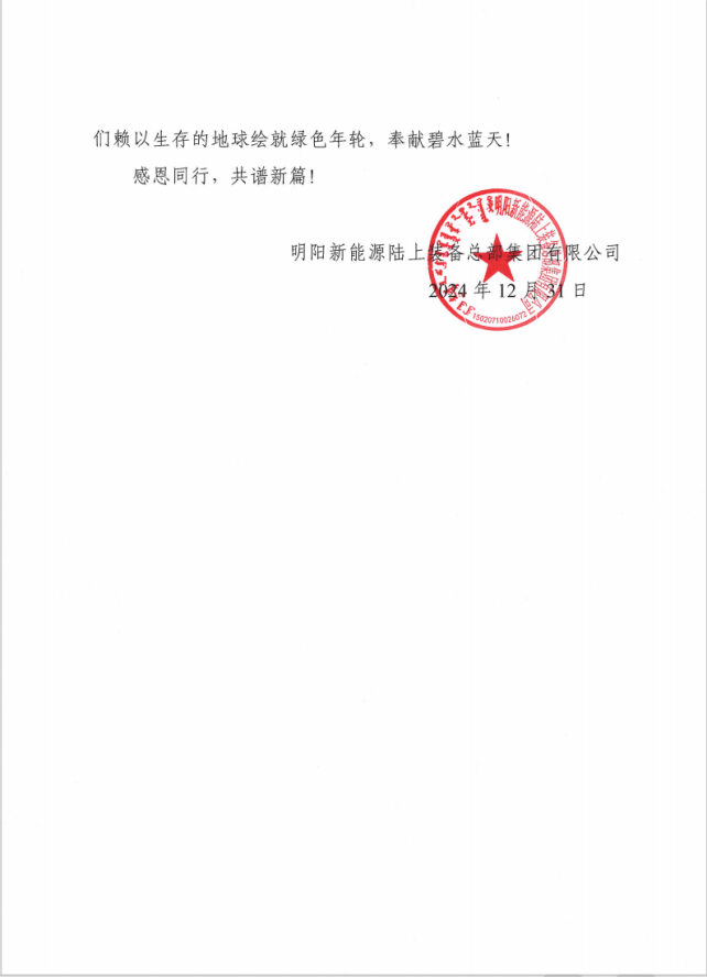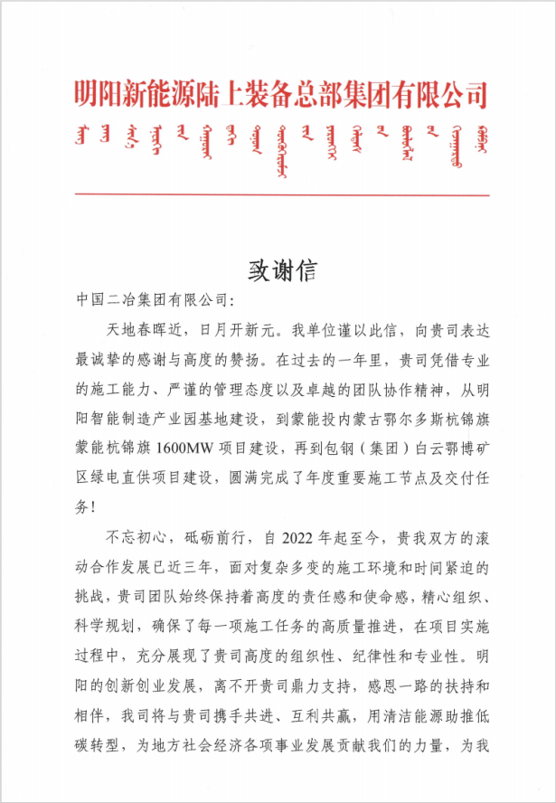 明陽智慧能源集團股份公司在感謝信中指出,2024年,貴司憑借專業(yè)的施工能力、嚴謹?shù)墓芾響B(tài)度以及卓越的團隊協(xié)作精神,從明陽智能制造產(chǎn)業(yè)園基地建設(shè),到蒙能投內(nèi)蒙古鄂爾多斯杭錦旗蒙能杭錦旗1600兆瓦項目建設(shè),再到包鋼(集團)白云鄂博礦區(qū)綠電直供項目建設(shè),圓滿完成了年度重要施工節(jié)點及交付任務(wù)。