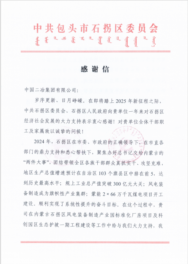 信中指出,2024年,石拐區在市委、市政府的正確領導下,在市直各部門的鼎力支持和悉心幫扶下,聚焦辦好習近平總書記交給內蒙古的“兩件大事”,團結帶領全區各族干部群眾真抓實干、攻堅克難,地區生產總值增速預計在自治區103個旗縣區中排在前5,達到歷史最高水平;規上工業總產值突破300億元大關;風電裝備制造成為旗幟性產業集群;蒙能2×66萬千瓦煤電項目開工建設。順利實現了系統性提升的奮斗目標。在這個過程中,中國二冶在內蒙古石拐區風電裝備制造產業園標準化廠房項目及科創園區生態護坡一期項目等工程建設中給予大力支持,我們銘記在心、深懷感激。明年是“十四五”規劃的收官之年,也是石拐區爬坡過坎、站上新的歷史臺階的關鍵一年。我們將繼續堅持以習近平新時代中國特色社會主義思想為指導,認真貫徹落實上級各項部署要求,以永不懈怠的精神狀態和一往無前的奮斗姿態,凝心聚力、團結拼搏,奮力實現歷史性跨越的奮斗目標。