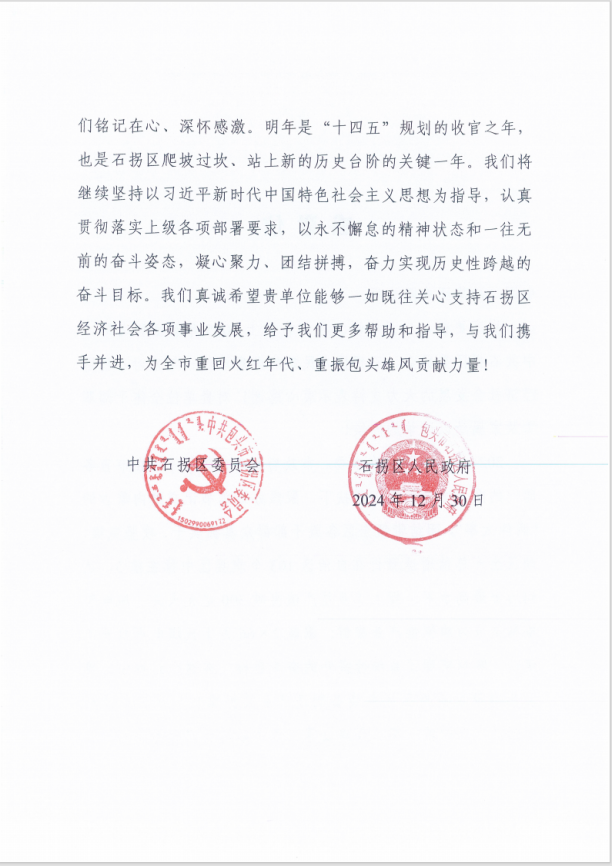 信中最后,石拐區政府真誠希望中國二冶能夠一如既往關心支持石拐區經濟社會各項事業發展,給予石拐區更多幫助和指導,并攜手并進,為全市重回火紅年代、重振包頭雄風貢獻力量!