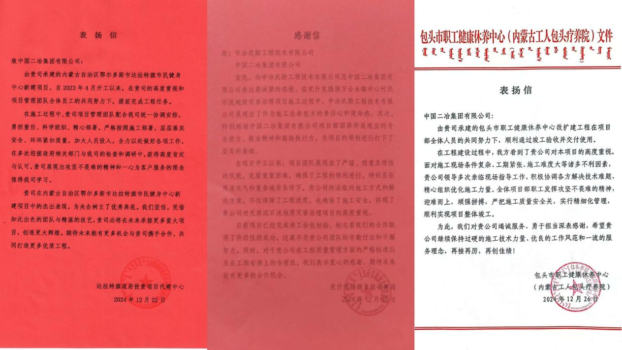 近日,中國二冶先后收到來自達拉特旗政府投資項目代建中心、克什克騰旗自然資源局以及包頭市職工健康休養中心的三封表揚信。信中高度贊揚了中國二冶在達旗健民中心項目、赤峰泥石流項目、包頭康養項目建設中展現出的卓越專業能力、嚴謹施工態度以及為地方經濟社會發展作出的積極貢獻。