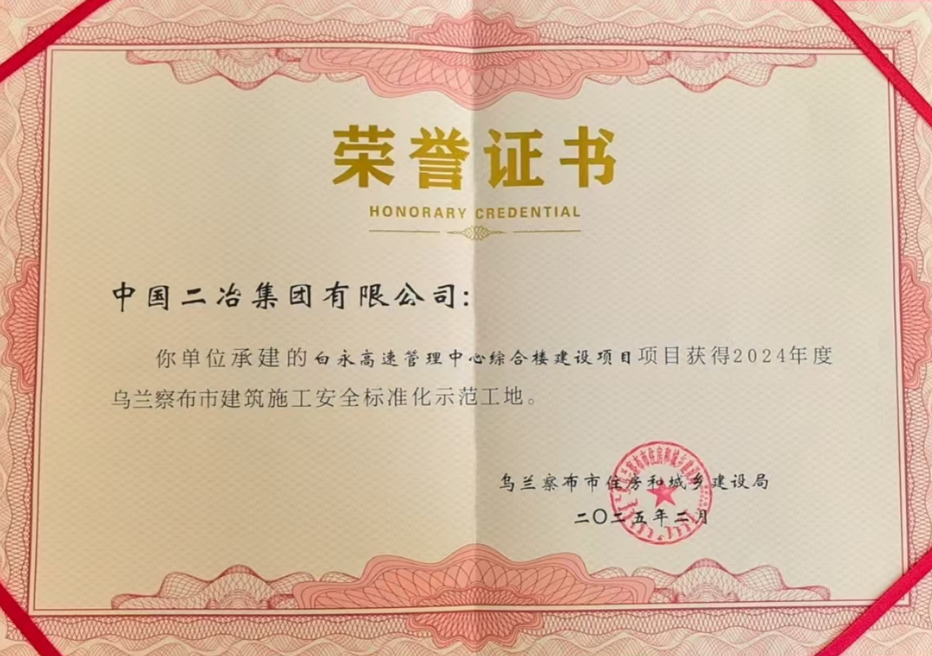 近日,由中國二冶承建的白永高速管理中心綜合樓建設項目榮獲2024年度“烏蘭察布市建筑施工安全標準化示范工地”稱號。