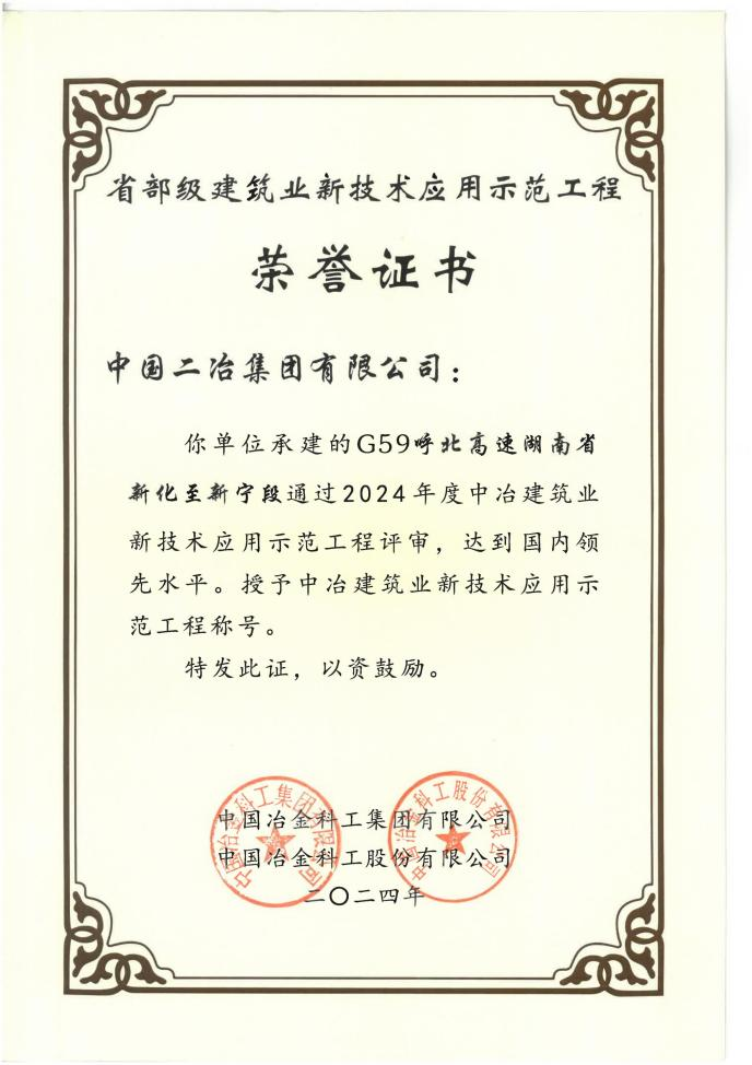 G59呼北高速湖南省新化至新寧段項目在施工過程中注重資源節(jié)約與環(huán)境保護,取得了良好的經濟效益和社會效益。項目成功推廣應用了建筑業(yè)10項新技術中的7大項22個子項,包括預應力技術、高強鋼筋應用技術、高性能鋼材應用技術等,同時創(chuàng)新應用了“預制箱梁腹板水平定位支架”等7項已有技術成果。此外,項目還開展了“預制裝配式蓋板涵工藝研究”等4項自主技術創(chuàng)新,并申請專利9件(其中發(fā)明專利1件),展現(xiàn)了顯著的技術實力。