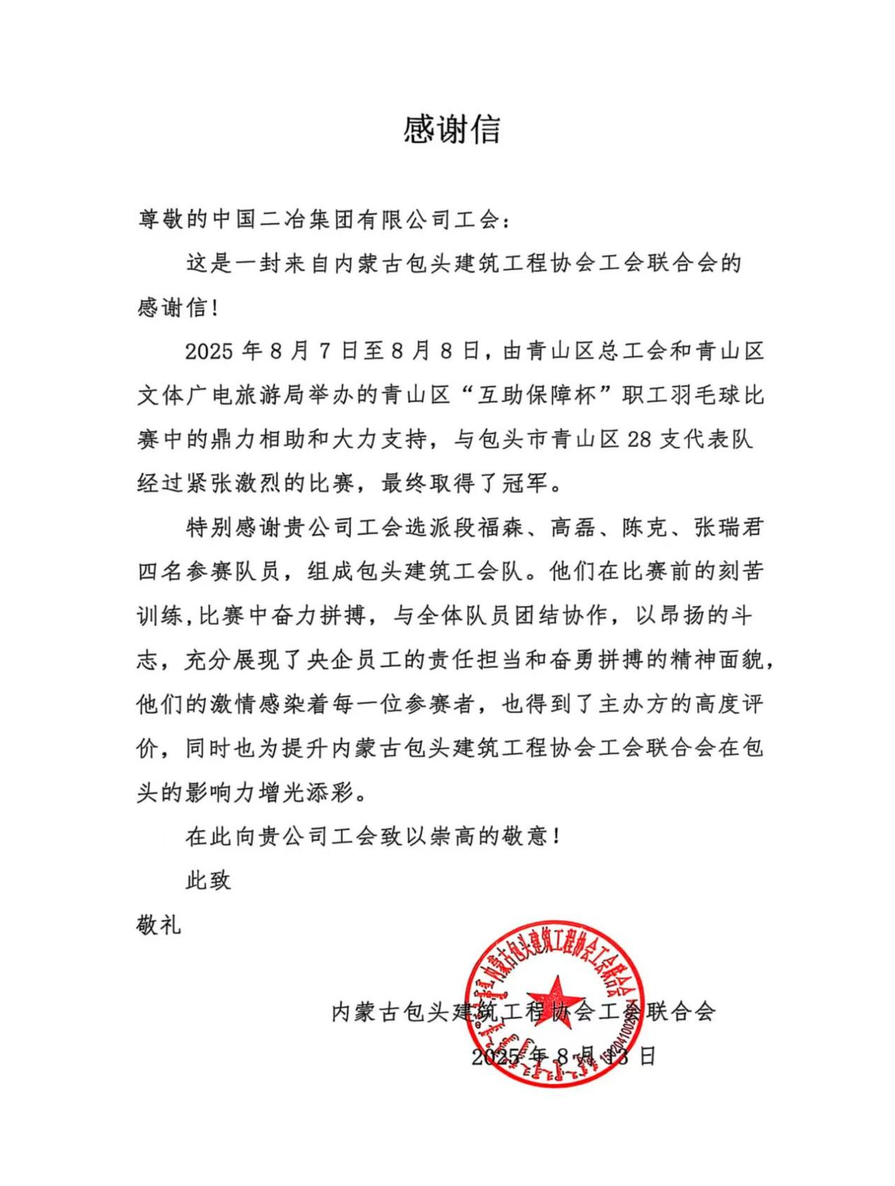 信中指出,8月7日至8日,由青山區(qū)總工會和青山區(qū)文體廣電旅游局舉辦的青山區(qū)“互助保障杯”職工羽毛球比賽在一機體育館舉行,由中國二冶工會選派的段福森、高磊、陳克、張瑞君等四名同志組成的包頭建筑協(xié)會代表隊,經(jīng)過艱苦拼搏,在28支代表隊中脫穎而出,榮獲了團體冠軍。
