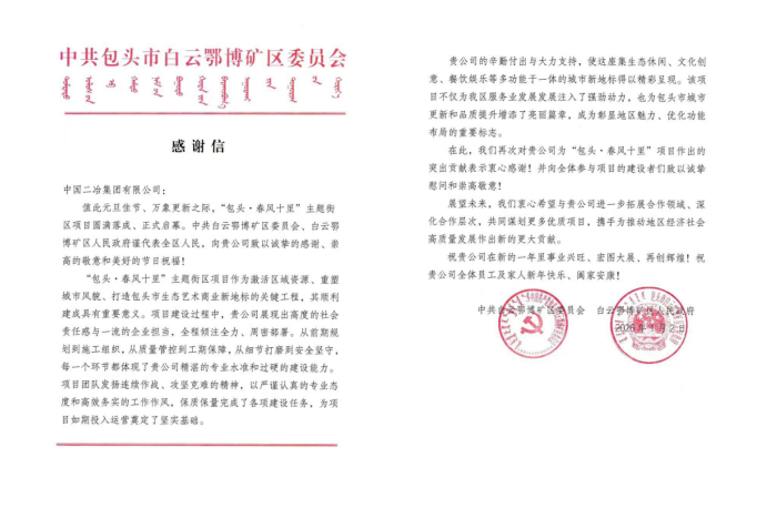 此次感謝及表揚,既是對中國二冶建設成果的高度認可,也是對團隊付出的充分信賴。未來,中國二冶將以此為激勵,持續深耕包頭城市建設領域,以更多優質精品工程賦能地方發展,為推動地區經濟社會高質量發展貢獻更大央企力量。