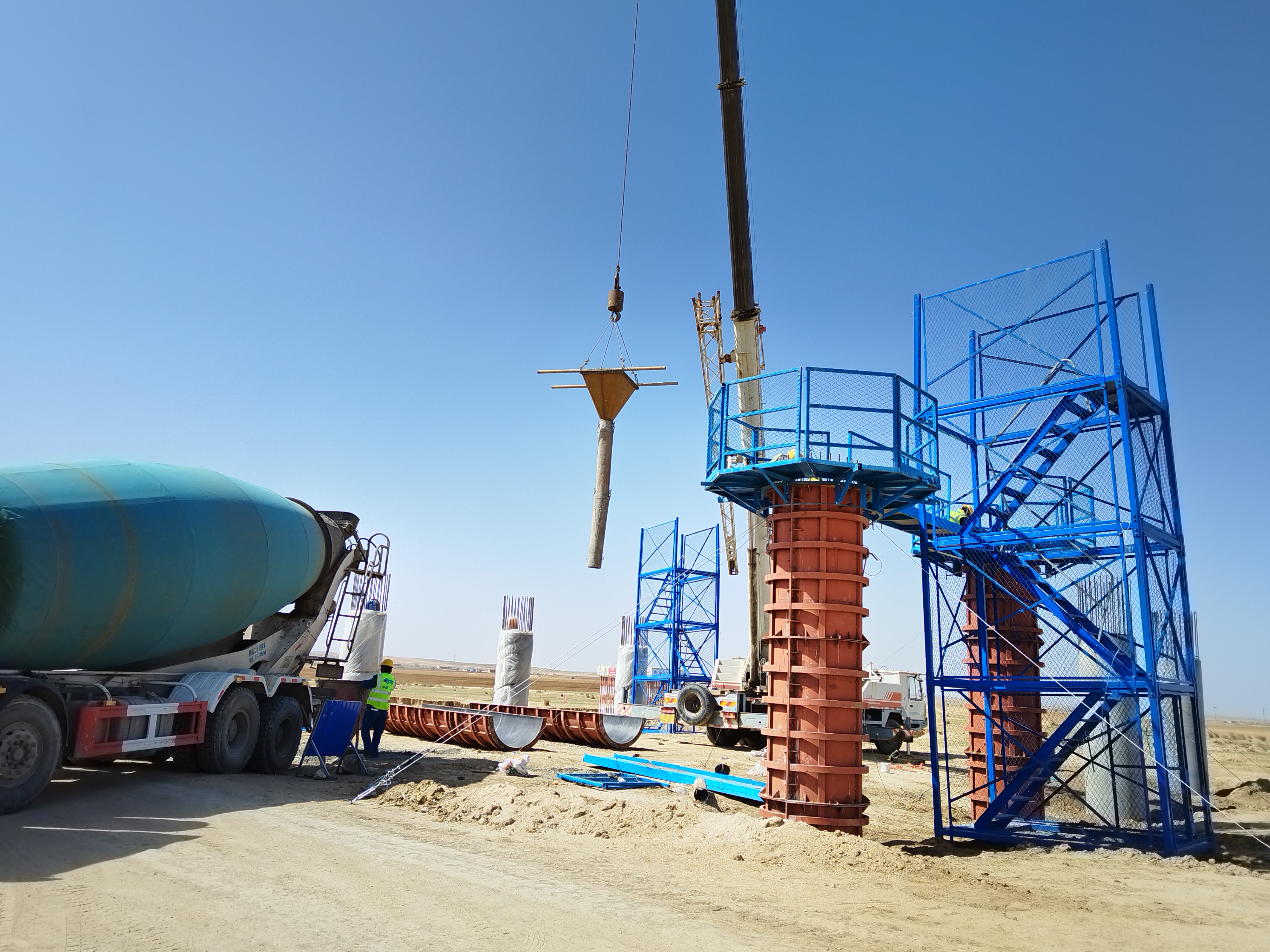該項目新建西壕口大橋位于固陽縣興順西鄉,全長340米,是項目重點控制性工程之一,大橋下部結構采用圓柱式墩,墩柱平均高度5米,直徑1.2米。進入五月以來,項目團隊深入貫徹落實上級公司大干100天、確保“雙過半”工作部署,時刻牢記“安全施工、優質施工、文明施工”要求,錨定目標、鉚足干勁,持續掀起大干高潮。項目部結合實際,細致梳理施工計劃并分解實施,提前安排人材機資源進場,對全員進行安全技術交底和班前安全教育,仔細檢查現場塔式爬梯、安全操作平臺及機具設備的安全性,統籌協調工程測量、原材料試驗檢測及 1#綜合場站混凝土輸送到位,滿足現場施工需求。