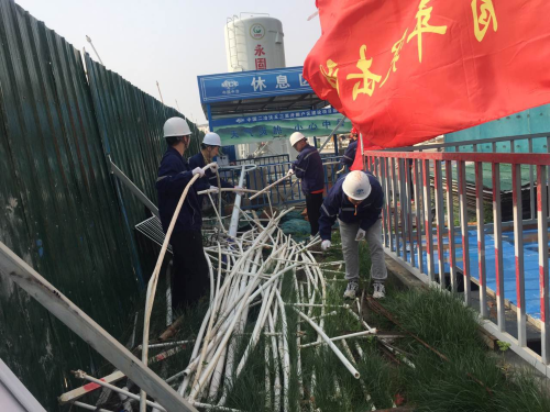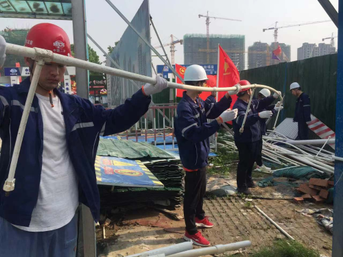 在義務(wù)勞動(dòng)活動(dòng)中,團(tuán)旗和青年突擊隊(duì)旗在工地迎風(fēng)飄揚(yáng),項(xiàng)目部團(tuán)員青年們利用手推車、三輪車對施工現(xiàn)場的廢棄鋼筋、土方布、鋼管,pvc水管等施工材料進(jìn)行了統(tǒng)一清理和歸類堆放,在搬運(yùn)施工材料的過程中,大家采取接力的形式將一車車施工材料堆放整齊,將廢棄物清理干凈,雖然大家干的汗流浹背,但始終歡聲笑語、干勁十足,沒有絲毫的停歇。