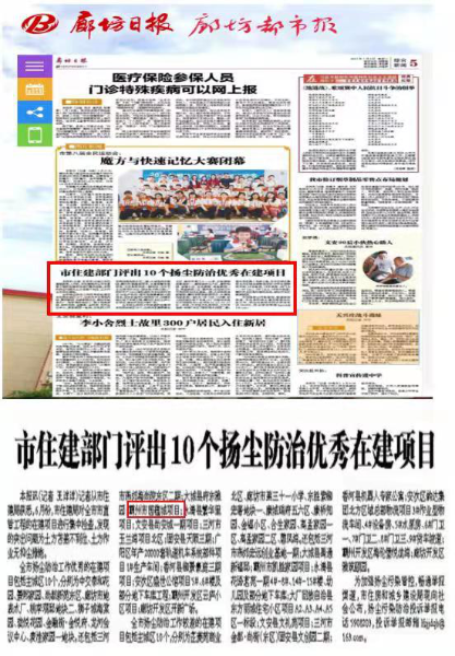 7月7日,從廊坊市住建局獲悉,中國二冶城建分公司河北霸州市國蘊城項目榮獲廊坊市揚塵防治優秀在建項目。《廊坊日報——綜合新聞》以題為《市住建部門評出10個揚塵防治優秀在建項目》進行跟蹤報道,并進行公布。