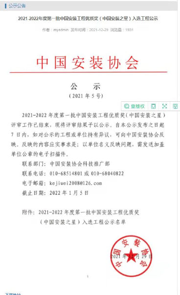 12月29日,中國(guó)安裝協(xié)會(huì)公布了2021--2022年度第一批中國(guó)安裝工程優(yōu)質(zhì)獎(jiǎng)(中國(guó)安裝之星)獎(jiǎng)。中國(guó)二冶內(nèi)蒙古達(dá)拉特旗90萬(wàn)噸/年鋁板帶項(xiàng)目獲得(中國(guó)安裝之星)獎(jiǎng)。